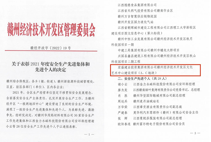 近日,贛州經(jīng)濟(jì)技術(shù)開發(fā)區(qū)管理委員會對全區(qū)安全生產(chǎn)先進(jìn)單位及個人進(jìn)行了通報表彰,以鼓勵各生產(chǎn)經(jīng)營單位始終堅定不移貫徹安全發(fā)展理念、全面落實安全生產(chǎn)主體責(zé)任、扎實開展安全生產(chǎn)工作,為贛州經(jīng)開區(qū)“一極兩地四中心”建設(shè)營造良好安全生產(chǎn)環(huán)境作出的貢獻(xiàn)。宏盛建業(yè)投資集團(tuán)“贛州經(jīng)濟(jì)技術(shù)開發(fā)區(qū)文化藝術(shù)中心建設(shè)項目(A、C地塊)”榮獲“安全生產(chǎn)先進(jìn)集體”榮譽稱號。
