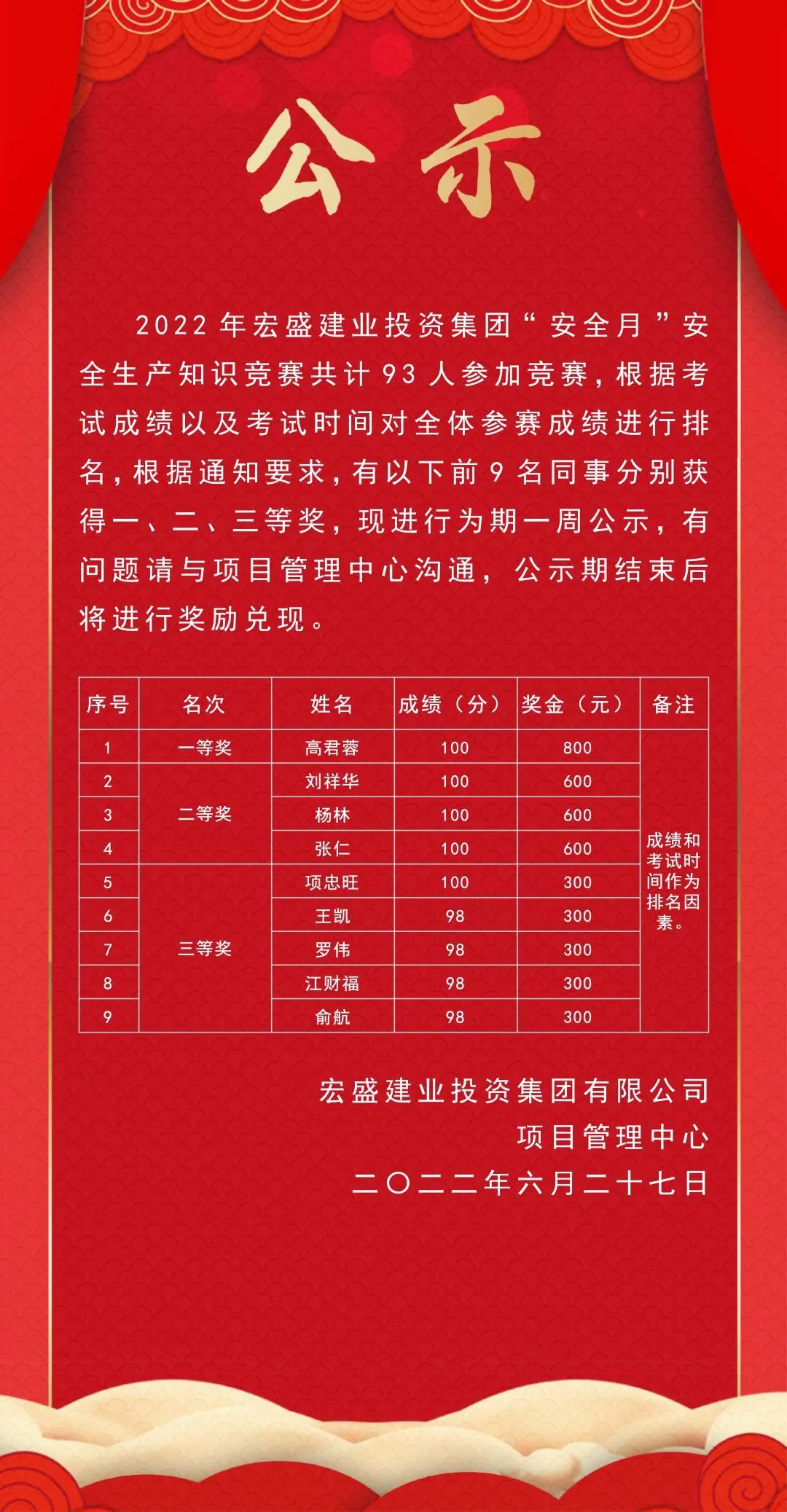 2022年6月20-24日,公司舉行安全知識網(wǎng)上競賽活動(dòng),本次活動(dòng)共計(jì)有93位員工參加了在線考試,他們是集團(tuán)所屬所有項(xiàng)目管理人員,所有項(xiàng)目工程管理派駐人員,所有分公司工程部管理人員。員工們扎實(shí)的安全知識為他們?nèi)〉昧瞬诲e(cuò)的成績,對這些優(yōu)秀的員工公司也對他們進(jìn)行了獎(jiǎng)勵(lì)。一等獎(jiǎng)1名,二等獎(jiǎng)3名,三等獎(jiǎng)5名,一等獎(jiǎng)獎(jiǎng)勵(lì)現(xiàn)金800元/人,二等獎(jiǎng)獎(jiǎng)勵(lì)600元/人,三等獎(jiǎng)獎(jiǎng)勵(lì)300元/人