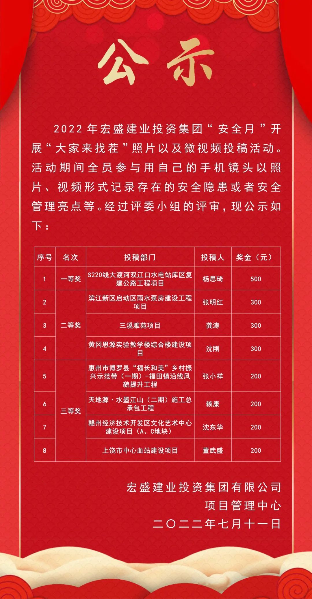 在安全月期間全員參與用自己的手機(jī)鏡頭以照片或者視頻形式記錄存在的安全隱患或者安全管理亮點(diǎn)等。利用身邊的素材對大家進(jìn)行安全宣傳;通過監(jiān)督渠道,曝光問題隱患,提高大家的安全意識。評委小組評審出優(yōu)秀的作品將進(jìn)行表彰以及獎(jiǎng)勵(lì)(一等獎(jiǎng)1名,二等獎(jiǎng)3名,三等獎(jiǎng)4名,一等獎(jiǎng)獎(jiǎng)勵(lì)現(xiàn)金500元/人,二等獎(jiǎng)獎(jiǎng)勵(lì)300元/人,三等獎(jiǎng)獎(jiǎng)勵(lì)200元/人,優(yōu)秀作品推薦發(fā)布到集團(tuán)期刊中。