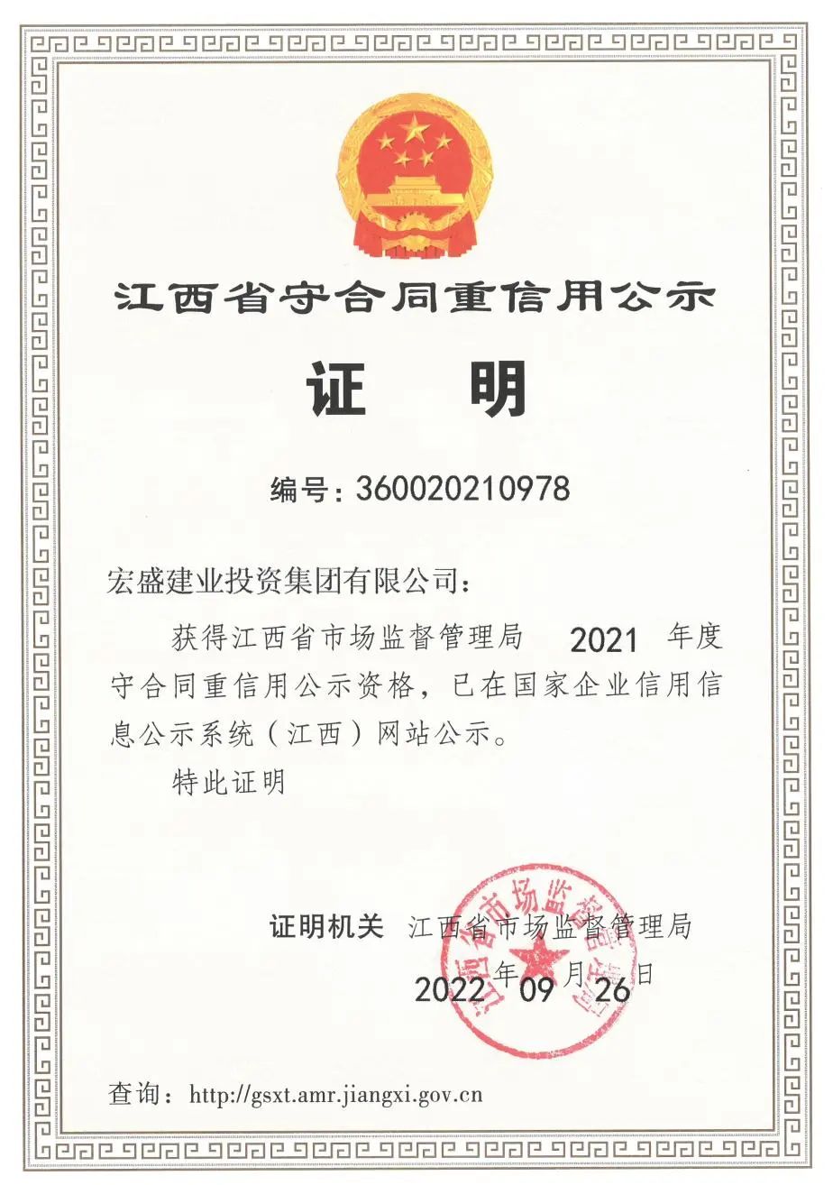 宏盛建業(yè)投資集團自2002年改制成立以來,始終遵循著“誠信、穩(wěn)健、創(chuàng)新、奉獻”的企業(yè)宗旨,高度重視企業(yè)信譽及合同管理工作,堅持“守合同重信用”的原則下砥礪前行,并將其視為企業(yè)生存與長期發(fā)展的基石,近年來已取得多項榮譽。