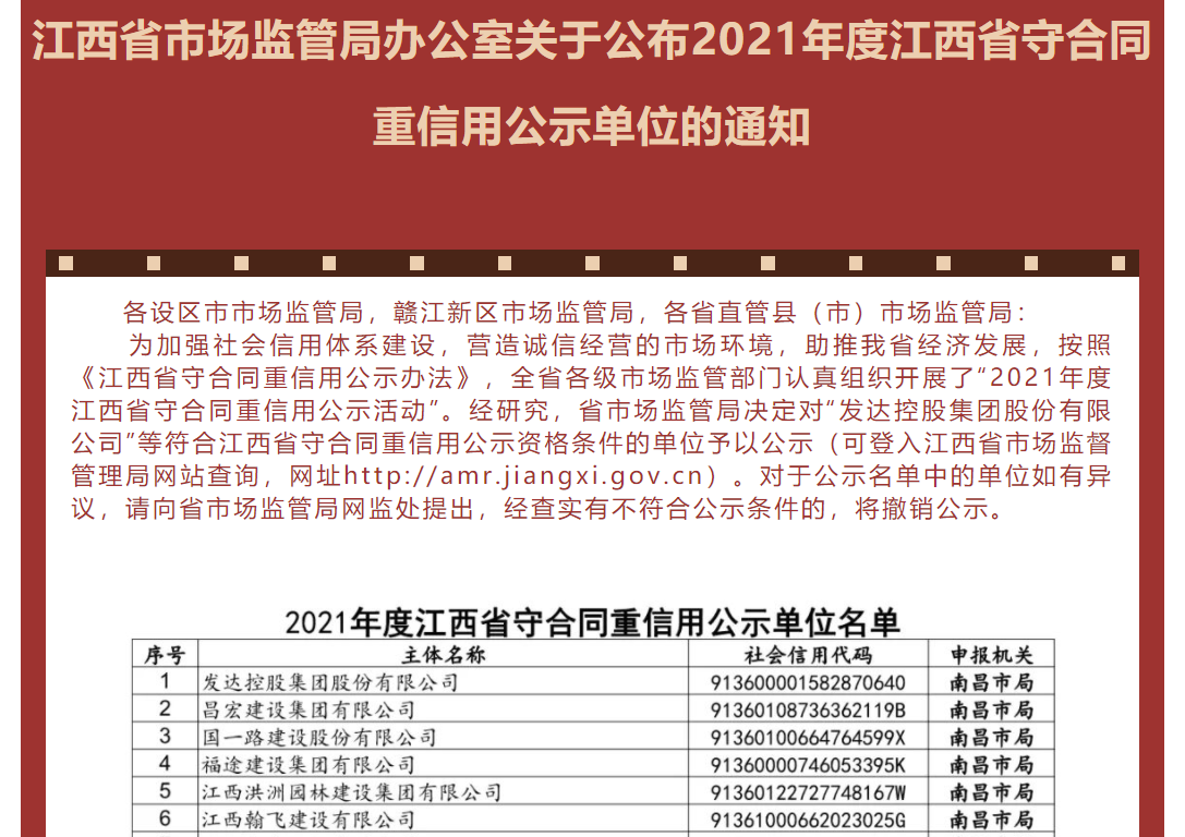 近日,江西省市場監(jiān)管局辦公室公布了關于2021年度江西省守合同重信用公示單位的通知,我司憑借著“依法經(jīng)營、誠實守信”的經(jīng)營理念,獲評江西省市場監(jiān)督管理局“2021年度守合同重信用”榮譽稱號。