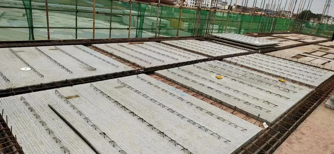 本次在贛州經開區(qū)文化藝術中心項目進行裝配的是預制疊合樓板。疊合板按照雙向受力模型進行設計,不僅整體剛度更好,承載力更高;而且最大程度節(jié)約了傳統(tǒng)樓板木模的使用,改良了樓板支模的施工工藝,縮短了施工周期,提高了施工的質量和精度,改善了施工環(huán)境,避免了施工可能造成的噪音、揚塵等環(huán)境污染,也更符合綠色施工的節(jié)能、節(jié)材、節(jié)水、節(jié)地、環(huán)保等要求。