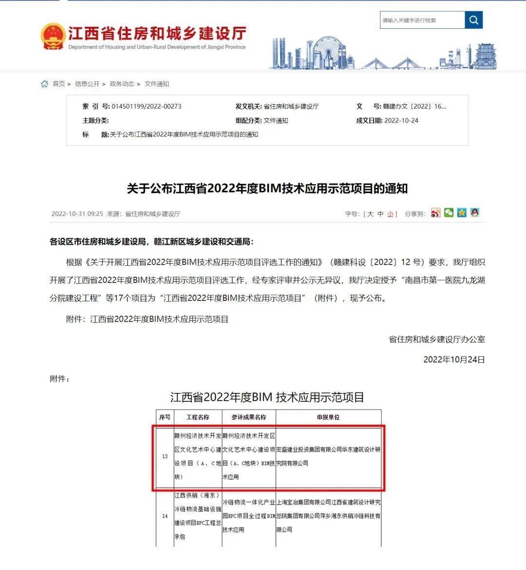 宏盛建業(yè)投資集團有限公司贛州經(jīng)濟技術(shù)開發(fā)區(qū)文化藝術(shù)中心建設(shè)項目(A、C地塊)榮獲江西省2022年度BIM技術(shù)應(yīng)用示范項目。