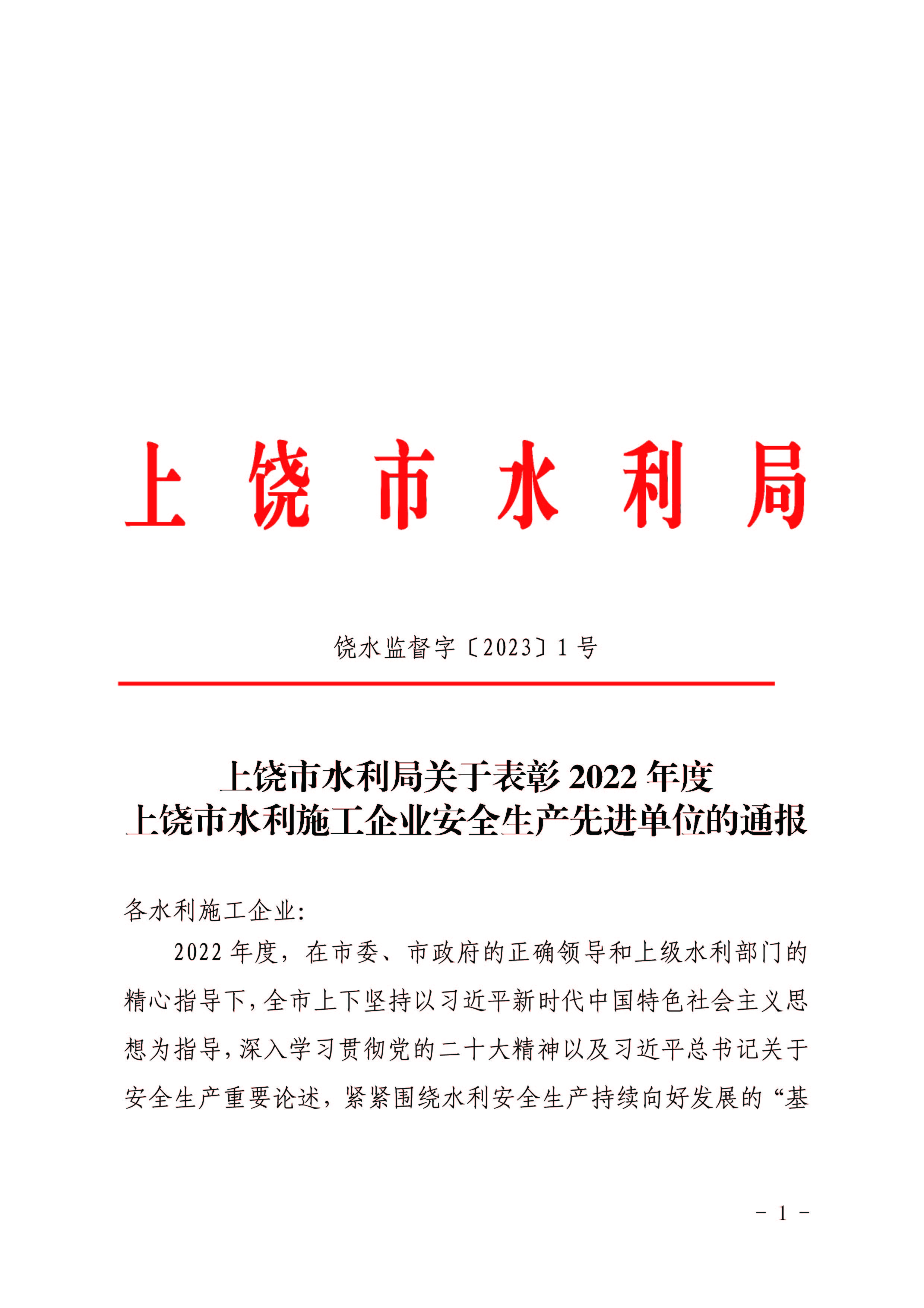 近日,上饒市水利局饒水監(jiān)督字〔2023〕1號中公布了關于表彰2022年度上饒市水利施工企業(yè)安全生產(chǎn)先進單位的通報。我集團憑借切實加強安全生產(chǎn)管理,明確安全生產(chǎn)責任,筑牢安全生產(chǎn)“三道線”的原則,獲評為2022年度上饒市水利施工企業(yè)安全生產(chǎn)先進單位。