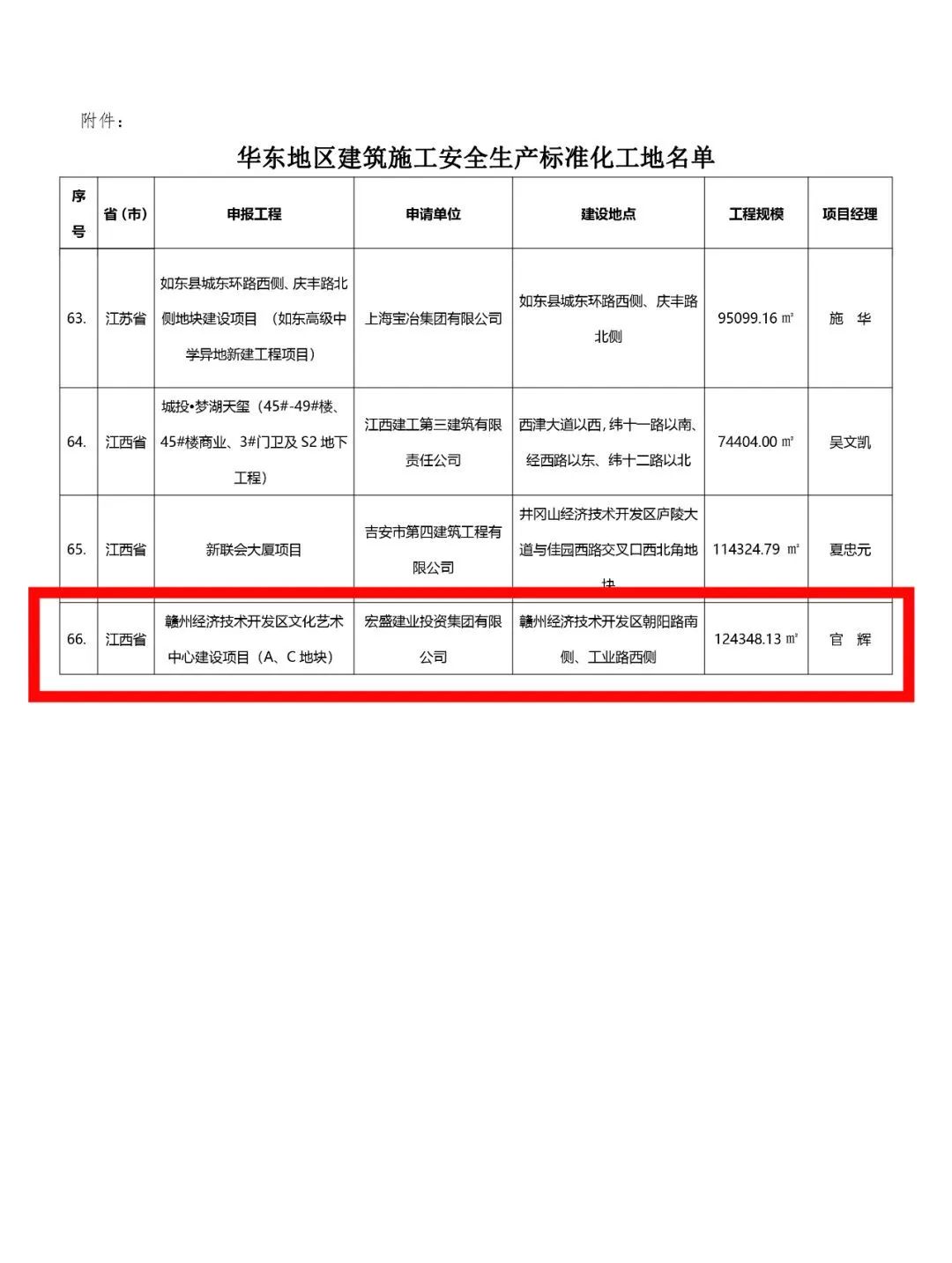 近日,山東省建筑安全與設(shè)備管理協(xié)會(huì)公示了關(guān)于2023 年度華東地區(qū)建筑施工安全生產(chǎn)標(biāo)準(zhǔn)化工地的名單,由我司宏盛建業(yè)投資集團(tuán)承建的“贛州經(jīng)濟(jì)技術(shù)開發(fā)區(qū)文化藝術(shù)中心建設(shè)項(xiàng)目(A、C)地塊”被評為“2023年度華東地區(qū)建筑施工安全生產(chǎn)標(biāo)準(zhǔn)化工地”。