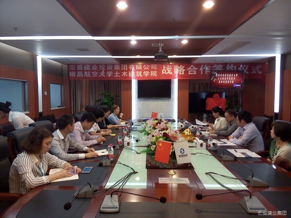 2014年10月17日,宏盛建業(yè)集團(tuán)與南昌航空大學(xué)土木建筑學(xué)院戰(zhàn)略合作簽約儀式在南昌總部大會(huì)議室舉行。昌航土建學(xué)院謝洪陽(yáng)院長(zhǎng)和行政人事總監(jiān)何丹分別代表雙方在《戰(zhàn)略合作協(xié)議》《技術(shù)開發(fā)(合作)合同》上簽字,并為共建的實(shí)訓(xùn)基地揭牌。