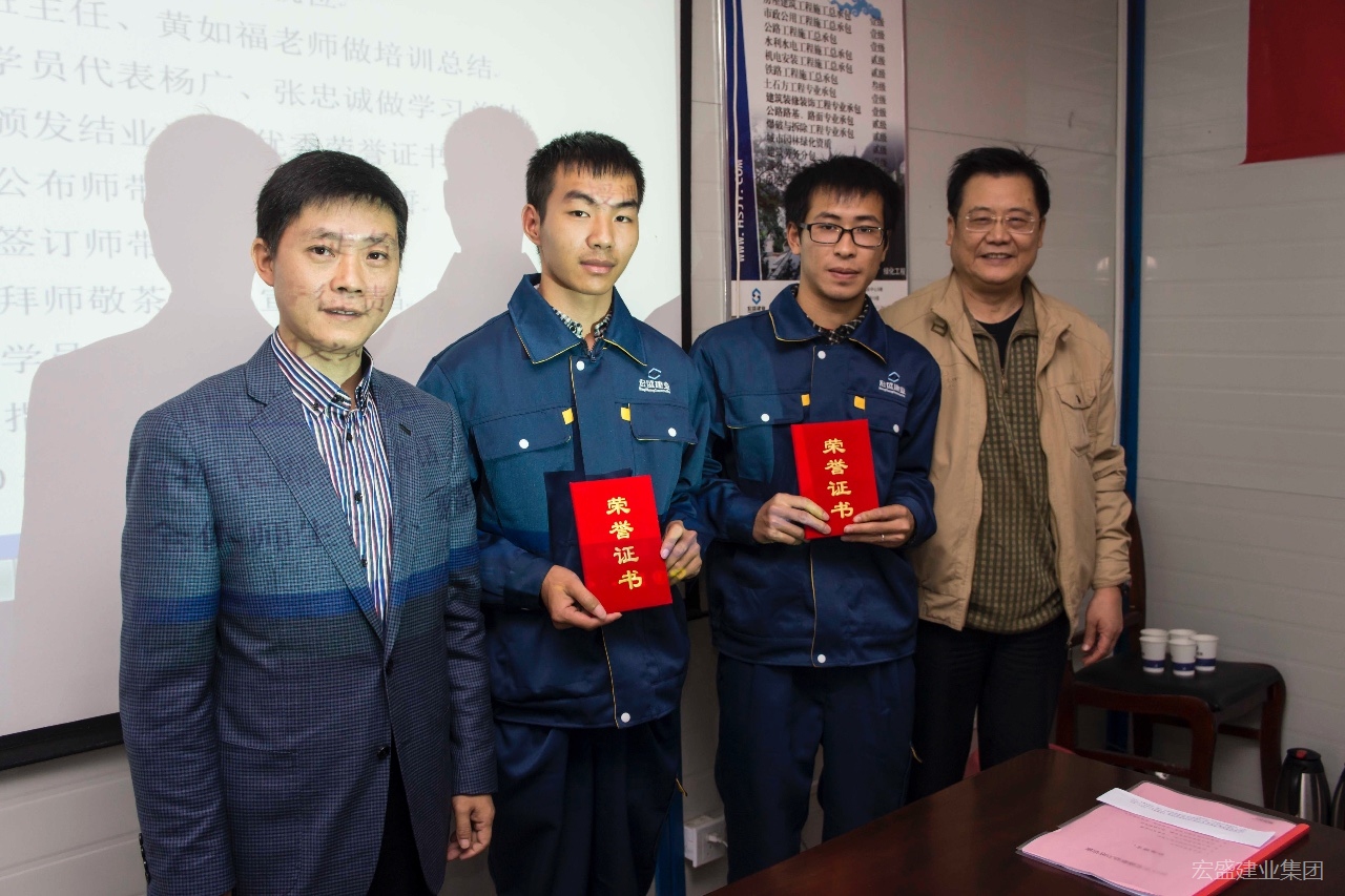 集團(tuán)公司2015年秋季招聘首期“新動(dòng)力、新未來(lái)、新發(fā)展”的新員工培訓(xùn),歷經(jīng)10天并經(jīng)嚴(yán)格的考試與考核,14位宏盛新員工順利結(jié)業(yè)。10月24日集團(tuán)公司在南江項(xiàng)目部舉辦了新員工結(jié)業(yè)暨拜師儀式,集團(tuán)公司副總裁周金旺及項(xiàng)目部各單位負(fù)責(zé)人出席本次活動(dòng)。新員工在各位導(dǎo)師的祝福與寄托中紛紛拿到了結(jié)業(yè)證書(shū)。