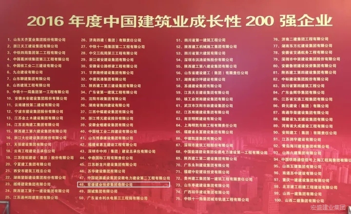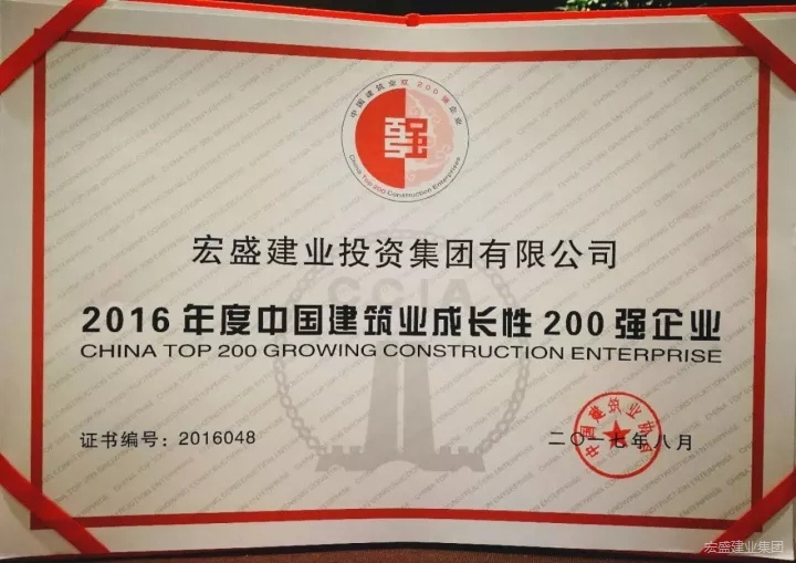 2017年11月26日,在由中國建筑業(yè)協(xié)會主辦的全國建筑業(yè)企業(yè)信用體系建設(shè)與創(chuàng)新發(fā)展經(jīng)驗交流會上,宏盛建業(yè)投資集團(tuán)被評為“2016年度中國建筑業(yè)成長性200強企業(yè)”,排名第48位。中國建筑業(yè)成長性200強企業(yè)評選,是中國建筑業(yè)協(xié)會按照《中國建筑雙200強企業(yè)評價辦法》,組成專家組,對申報企業(yè)的基礎(chǔ)數(shù)據(jù)、有關(guān)指數(shù)計算的過程和計算結(jié)果進(jìn)行了認(rèn)真的復(fù)核和審查,綜合評比,公示后形成的排名順序,具有很強的權(quán)威性和行業(yè)引領(lǐng)作用。