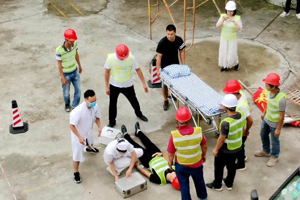 演練內(nèi)容為G325跨線橋現(xiàn)澆段施工時,由于支架搭設操作失誤,發(fā)生坍塌,受傷工人墜落在支架坍塌處?,F(xiàn)場作業(yè)人員發(fā)現(xiàn)有人員墜落后第一時間呼救,現(xiàn)場安全員聽見呼救,第一時間趕到事故現(xiàn)場后,即刻責令現(xiàn)場停止施工,隨即撥打開平市沙岡張立群醫(yī)院電話急救,并向現(xiàn)場技術(shù)員及項目負責人報告,項目負責人接到報告后立即向警戒保衛(wèi)組、醫(yī)療救助組、物資保障組下達應急救援行動指令,并向建設單位、總監(jiān)辦、總公司報告情況。