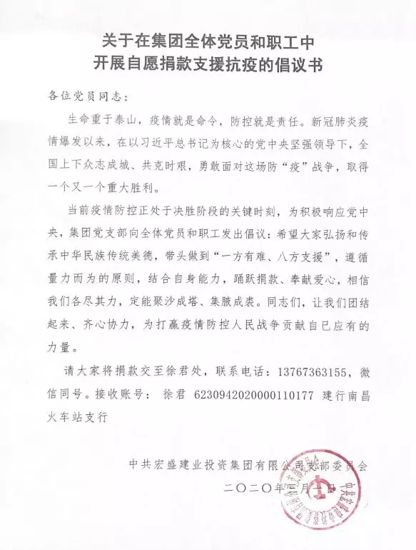 “抗擊疫情當(dāng)先鋒,身體力行作表率”。在疫情面前,以集團董事長周金虎、副董事長周金旺同志為代表的一大批共產(chǎn)黨員,挺身而出,力求作為,截止目前,宏盛建業(yè)已從全國和海外采購了價值340多萬元的醫(yī)療防護物資,用于無償捐贈,為上饒市、新余市、宜春市、宜賓市、巴中市、四川涼山州,上海等市轄區(qū)的相關(guān)單位抗疫出力,出資近百萬元無償援建上饒市負壓病房和醫(yī)療廢物暫存站2個抗疫項目。