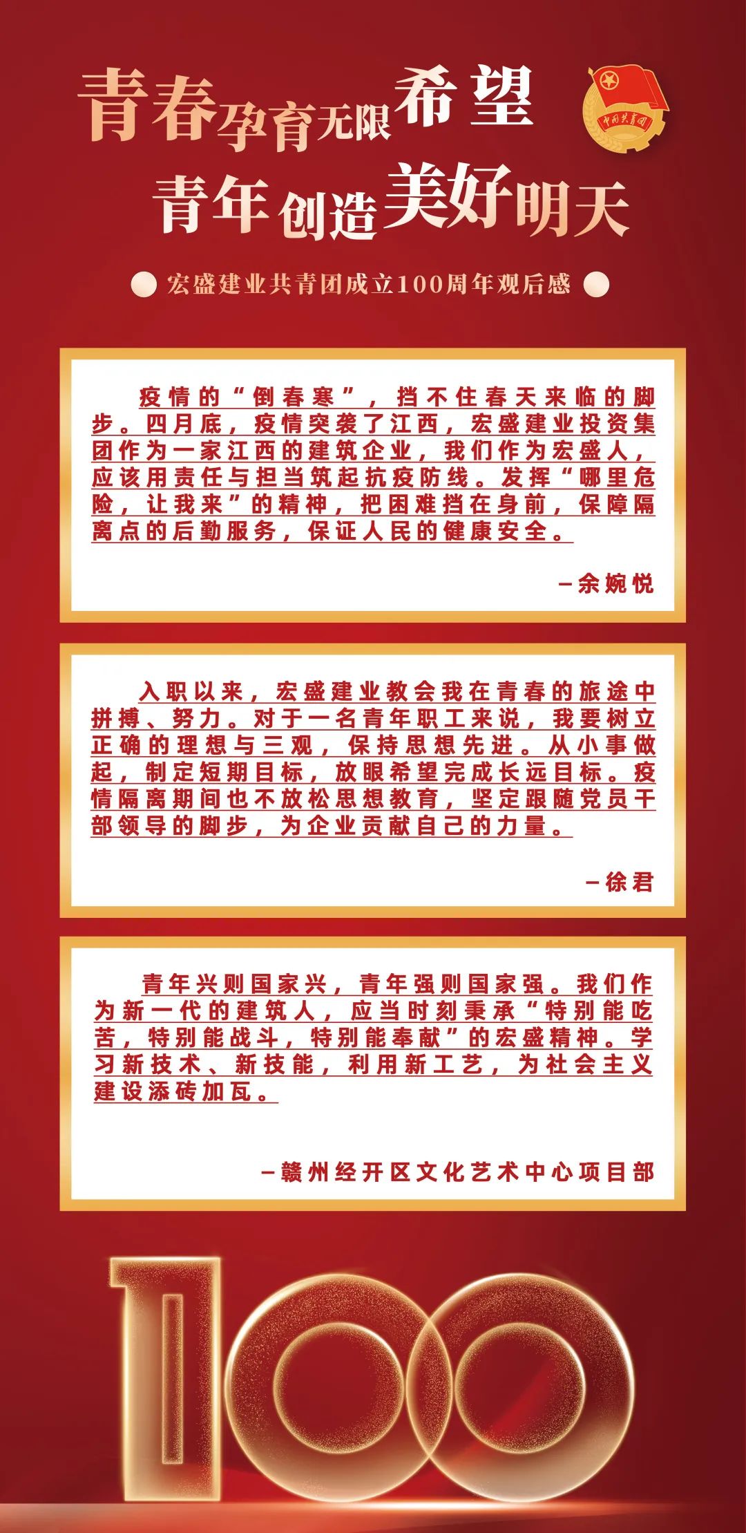 5月10日,中共中央總書記、國家主席、中央軍委主席習(xí)近平在慶祝中國共青團(tuán)成立100周年大會上發(fā)表重要講話。中共宏盛建業(yè)投資集團(tuán)有限公司黨支部組織全國各項(xiàng)目部及分子機(jī)構(gòu)的廣大青年集中收聽收看大會實(shí)況直播,共同聆聽習(xí)近平總書記的重要講話。廣大宏盛青年們齊聚大屏幕前,聚精會神地收看大會直播。