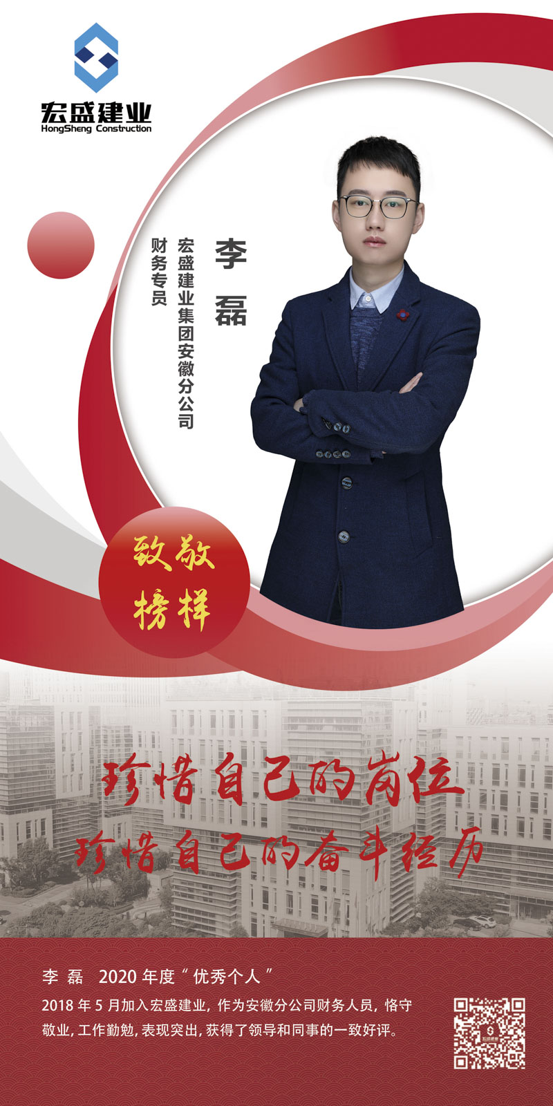 2018年,李磊加入集團,2019年入職集團安徽分公司擔任財務專員。負責處理安徽分公司日常費用報銷、辦公室用品采購事宜,同時也要負責跟進、對接安徽分公司范圍內所有項目從開具外經證到撥付工程款的一系列配套工作。除此之外,他還兼任了集團樂平市第十九小學項目財務工作及項目分公司工作。