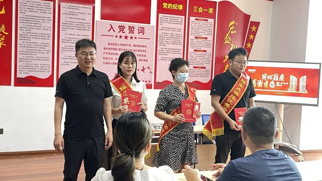 2022年7月1日上午9:30分上饒市建筑科技產(chǎn)業(yè)園抗疫一線工作人員表彰大會在建業(yè)大廈二樓黨群活動室舉行。上饒市建筑科技產(chǎn)業(yè)園總經(jīng)理何德洪、常務副總經(jīng)理程文龍、副總經(jīng)理趙慧出席會議,為疫情期間,堅守崗位、無私奉獻、共同抗疫的員工們頒發(fā)榮譽證書及慰問金。