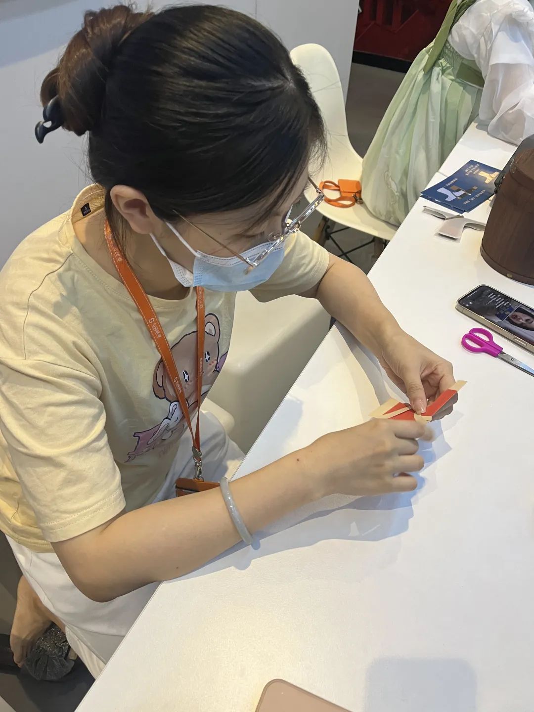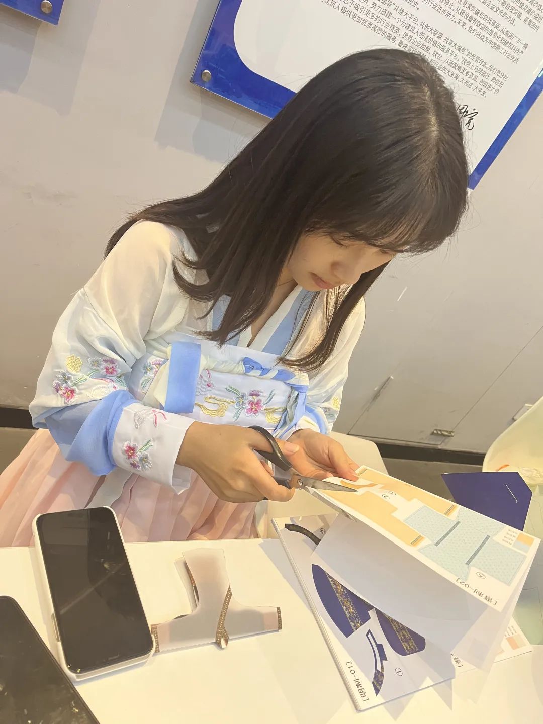 心靈手巧的同事們,照著圖紙,拿起手中已經(jīng)被剪好的圖案進行拼接,通過家人們的手,一件件小巧精致的漢服被展現(xiàn)在我們的眼前。