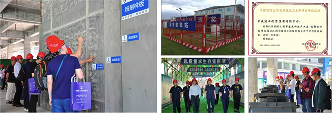 在材料方面,嚴(yán)格執(zhí)行驗(yàn)收制度,對于各種質(zhì)量難題,項(xiàng)目部特別成立QC攻關(guān)小組進(jìn)行專門攻關(guān),通過開展QC質(zhì)量小組活動,解決了粉刷質(zhì)量通病防治、不規(guī)則部位內(nèi)外腳手架搭設(shè)、外輪廓尺寸控制等多項(xiàng)本工程的質(zhì)量難點(diǎn),為創(chuàng)魯班打下堅(jiān)實(shí)基礎(chǔ)。裝修施工期間特別制定完善的成品保護(hù)機(jī)制以減少損失和污染,同時(shí)也為上饒市創(chuàng)國家衛(wèi)生城市工作保駕護(hù)航。為積極響應(yīng)國家政策,積極踐行綠色施工,項(xiàng)目采用了多種“四節(jié)一環(huán)?!贝胧?,例如揚(yáng)塵控制、永臨結(jié)合等,還使用了多種節(jié)能設(shè)施。自主研發(fā)使用的建筑垃圾垂直運(yùn)輸系統(tǒng),具有便于拆裝、重復(fù)周轉(zhuǎn)、節(jié)材環(huán)保,限制揚(yáng)塵和使用安全的特點(diǎn),產(chǎn)品及工藝獲得了《一種用于施工過程的安全環(huán)保限塵系統(tǒng)》(ZL 2018104728730)和《一種用于施工現(xiàn)場建筑垃圾收集裝置》(ZL 2018104727475)兩項(xiàng)發(fā)明專利授權(quán);經(jīng)科技成果鑒定認(rèn)定其技術(shù)已達(dá)到國內(nèi)領(lǐng)先水平;其施工工藝獲批江西省省級工法《建筑垃圾垂直輸送系統(tǒng)的施工工法》(贛建建[2020]4號)。綠色施工成果得到我省建筑業(yè)協(xié)會和中國建筑業(yè)協(xié)會的認(rèn)可;由中建協(xié)主辦,本項(xiàng)目施工單位協(xié)辦,在本項(xiàng)目現(xiàn)場召開了江西省首次全國級別的綠色施工交流會。