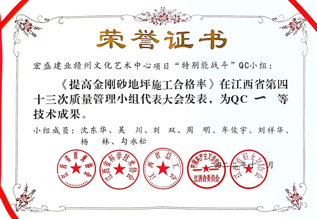 宏盛建業(yè)贛州文化藝術中心項目QC成果《提高金剛砂地坪施工合格率》榮獲一等技術成果獎。