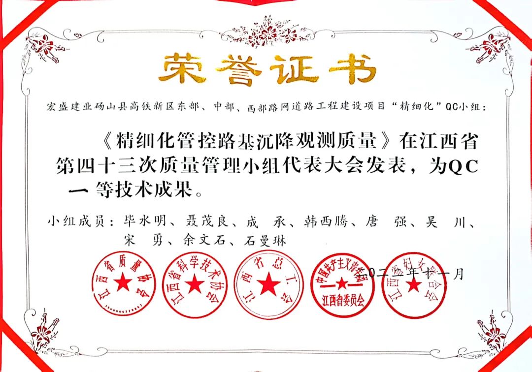 宏盛建業(yè)碩山縣高鐵新區(qū)東部、中部、西部路網道路工程建設項目QC成果《精細化管控路基沉降觀測質量》榮獲一等技術成果獎