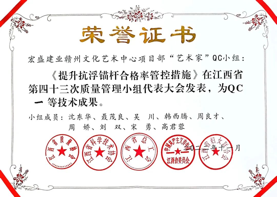 宏盛建業(yè)贛州文化藝術中心項目QC成果《提升抗浮錨桿合格率管控措施》榮獲一等技術成果獎