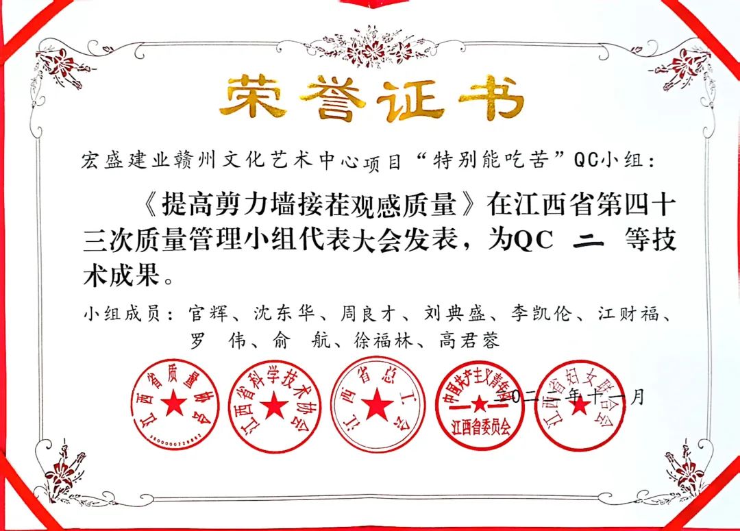 宏盛建業(yè)贛州文化藝術中心項目QC成果《提高剪力墻接茬觀感質量》榮獲二等技術成果獎