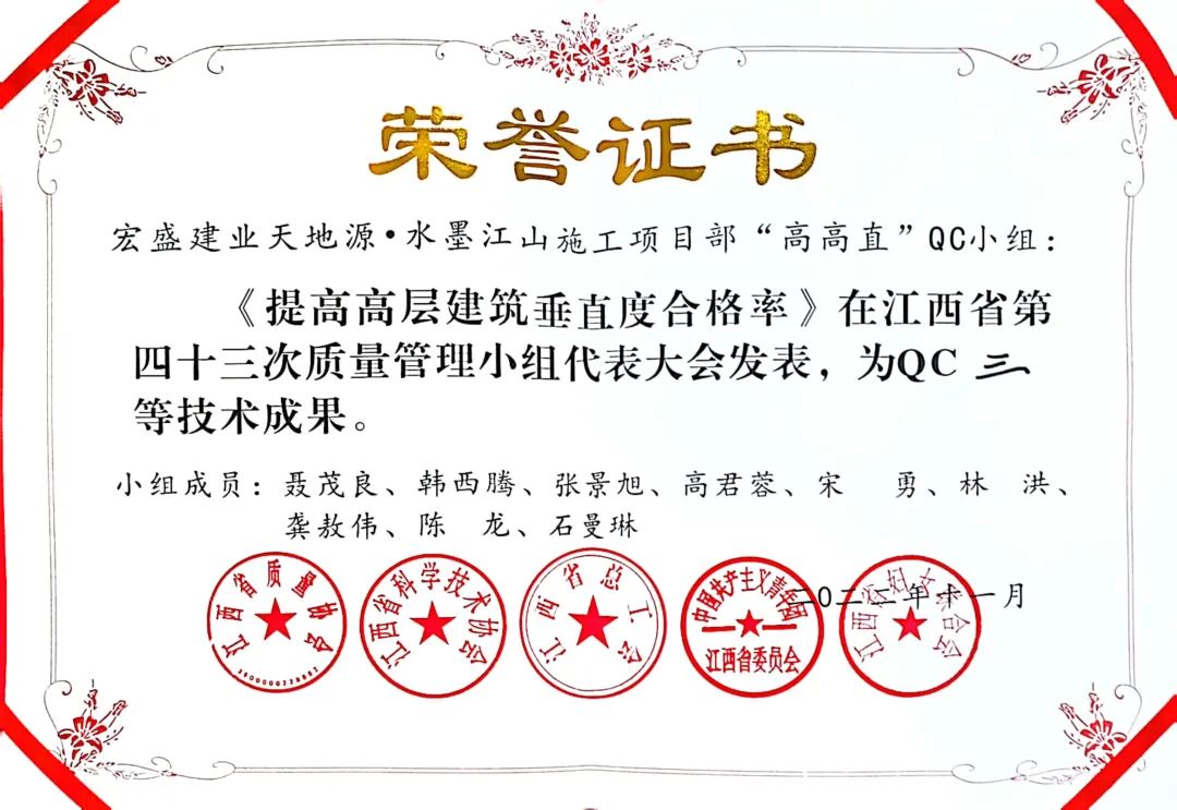 宏盛建業(yè)天地源·水墨江山施工項目QC成果《提高高層建筑垂直度合格率》榮獲三等技術成果獎