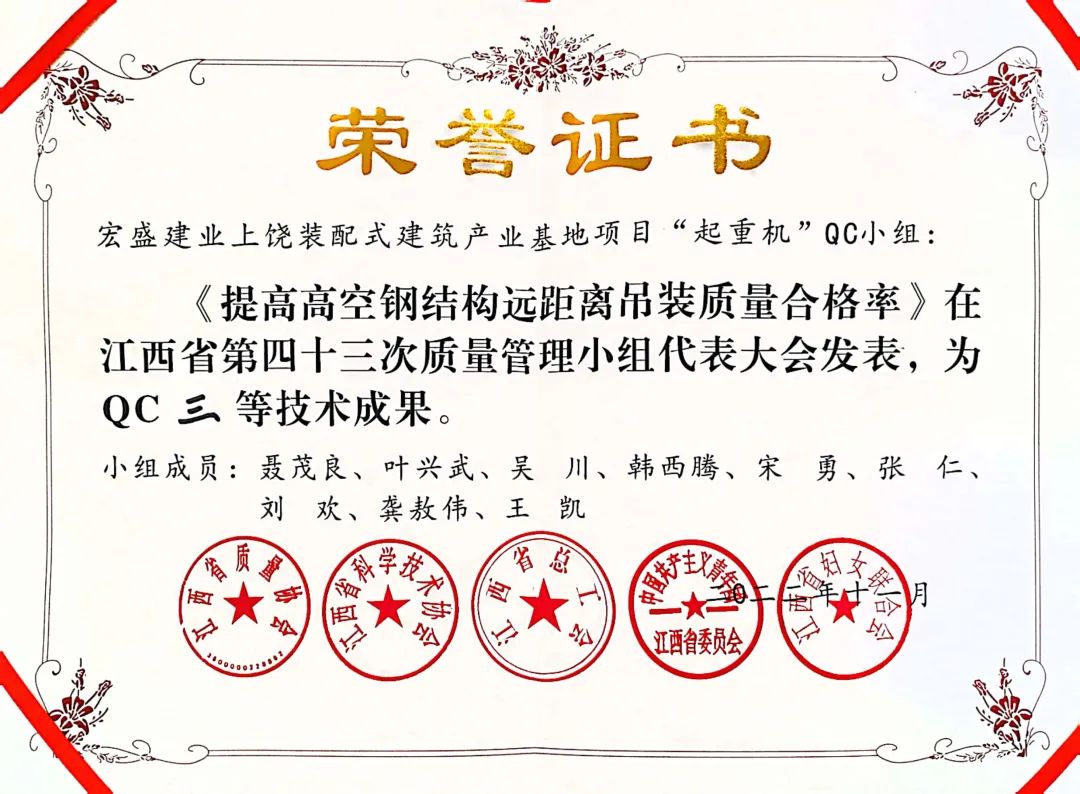 宏盛建業(yè)上饒裝配式建筑產業(yè)基地項目QC成果《提高高空鋼結構遠距離吊裝質量合格率》榮獲三等技術成果獎
