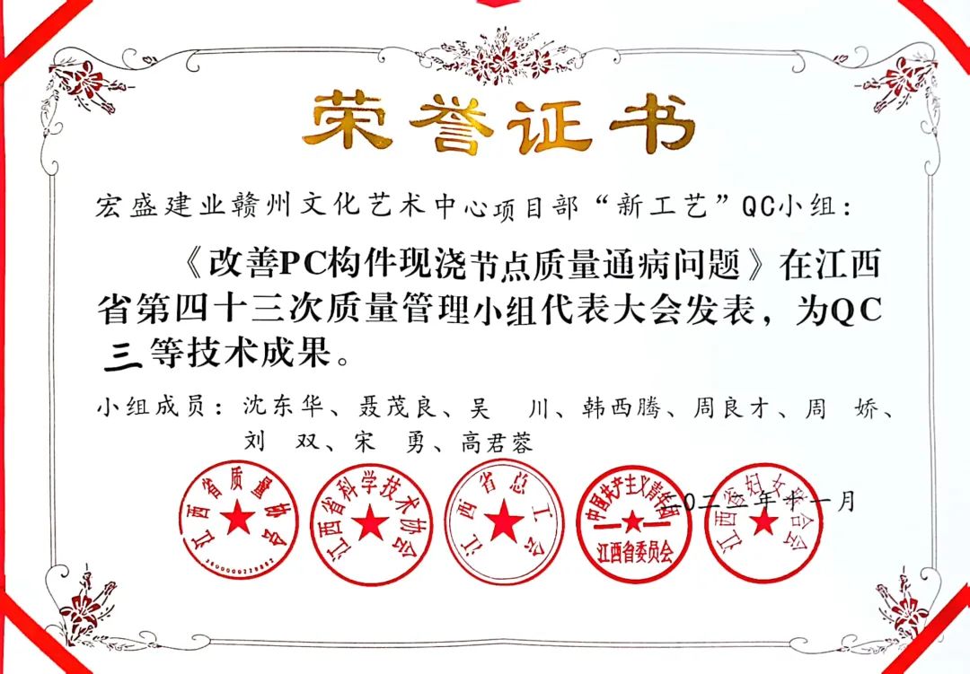 宏盛建業(yè)贛州文化藝術中心項目QC成果《改善PC構件現(xiàn)澆節(jié)點質量通病問題》榮獲三等技術成果獎