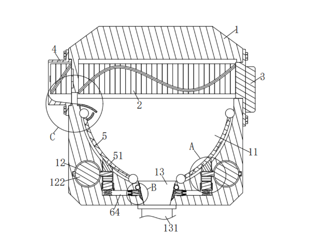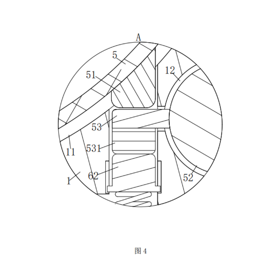 隨著凸塊間歇地?cái)D壓著頂塊與推塊,使假板在刨腔內(nèi)上下發(fā)生彈性形變,從而使假板表面上的白灰粉末快速地向出料槽口中軸線處方向移動(dòng),同時(shí)推塊擠壓著一號(hào)通道內(nèi)的空氣,使空氣帶動(dòng)著推板在一號(hào)通道內(nèi)移動(dòng),并且推板帶動(dòng)著活動(dòng)板在出料槽口內(nèi)壁上轉(zhuǎn)動(dòng),在復(fù)位彈簧和扭簧的作用下,使活動(dòng)板在出料槽口側(cè)邊上反復(fù)轉(zhuǎn)動(dòng),從而使活動(dòng)板攪動(dòng)出 料槽口處的白灰粉末,增加白灰粉末在出料槽口處的流動(dòng)性,相較現(xiàn)有工作人員通過拆開刨墻機(jī)來(lái)清理刨腔內(nèi)堆積的白灰粉末,本技術(shù)方案能減少工作人員拆開刨墻機(jī)的頻率,降低白灰粉末在刨腔內(nèi)部堆積的情況出現(xiàn),從而減輕白灰粉末影響工作人員鏟灰的工作效率 的問題;將保護(hù)罩靠近引導(dǎo)板一側(cè)的內(nèi)壁設(shè)置為弧形傾斜面,且弧形傾斜面與引導(dǎo)板表面相齊平,從而使墻角鏟下的白灰粉末沿著引導(dǎo)板移動(dòng)到刨腔內(nèi)部,并且假板通過弧形板間歇地與引導(dǎo)板底部相接觸,從而使引動(dòng)板在刨腔內(nèi)部發(fā)生振動(dòng),加快了白灰粉末進(jìn)入刨腔內(nèi)部的速度,相較現(xiàn)有保護(hù)罩只能將墻角鏟下的白灰粉末引導(dǎo)到地面上,本技術(shù)方案能減少墻角鏟下的白灰粉末與地面相接觸,而導(dǎo)致白灰粉末在空氣中擴(kuò)散的情況出現(xiàn),減輕白灰粉末危害工作人員呼吸道的問題。