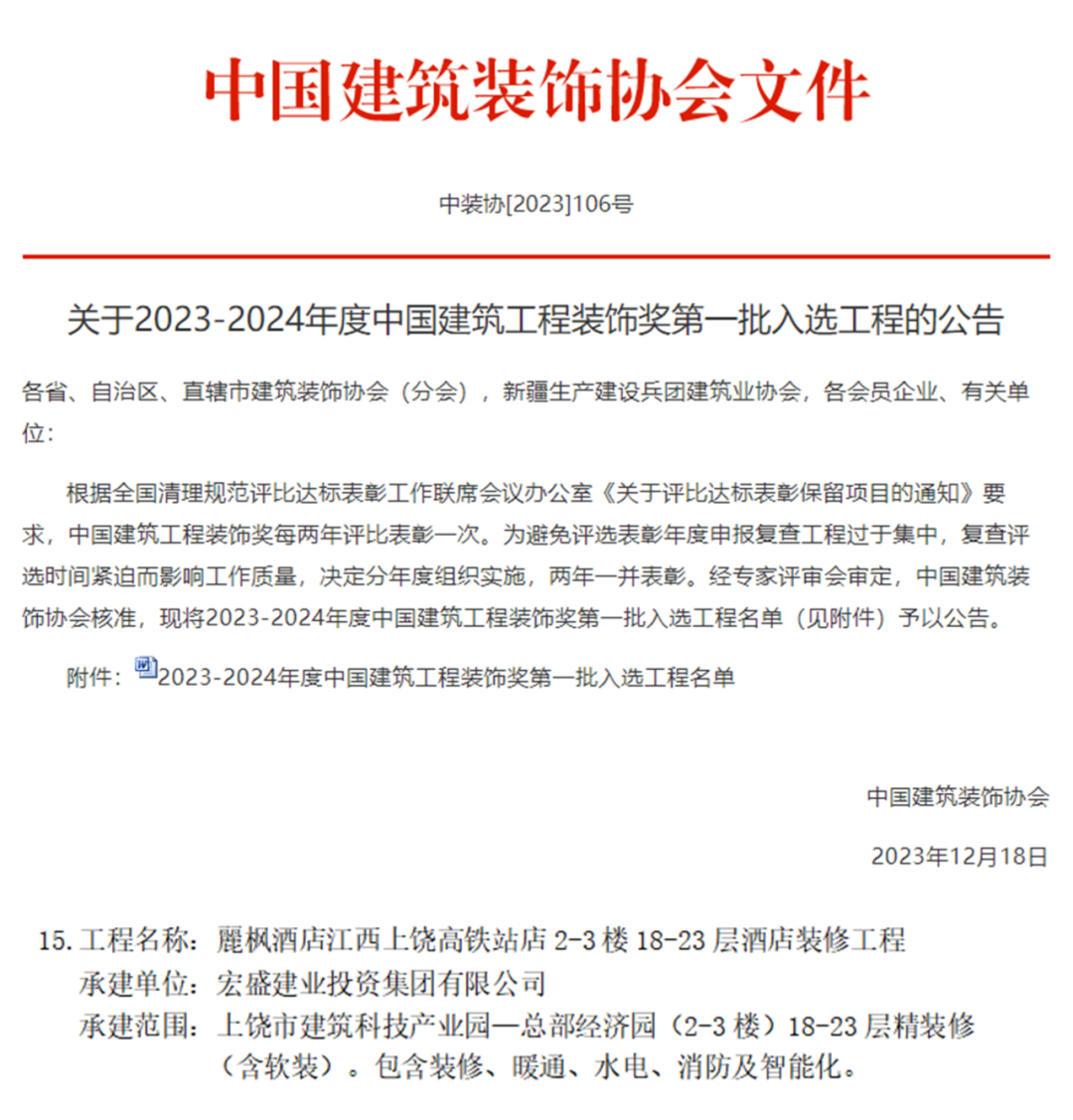 中國建筑工程裝飾獎是經(jīng)住房和城鄉(xiāng)建設部批準,由中國建筑裝飾協(xié)會主辦的評選活動,是中國建筑裝飾行業(yè)的最高榮譽獎,代表了全國建筑裝飾裝修領域內(nèi)工程質(zhì)量最高水平。經(jīng)評審委員會嚴格評定,宏盛建業(yè)集團承建項目——麗楓酒店江西上饒高鐵站店2-3樓18-23層酒店裝修工程脫穎而出榮獲中國建筑工程裝飾獎。