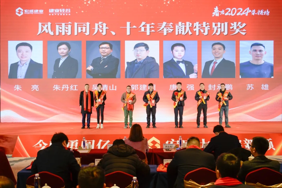 其中,“風(fēng)雨同舟·十年奉獻(xiàn)特別貢獻(xiàn)獎(jiǎng)”尤為令人動(dòng)容,朱亮、朱丹紅、吳清山等多位員工因十年如一日的堅(jiān)守與奉獻(xiàn),成為集團(tuán)最寶貴的財(cái)富。他們的故事激勵(lì)著每一位宏盛人,以更堅(jiān)定的信念投入到未來(lái)的奮斗中。