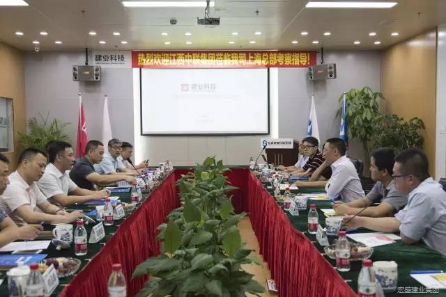 8月6日江西中聯(lián)建設(shè)集團有限公司董事長李海文、副董事長李志文、江西中耀建設(shè)有限公司總經(jīng)理李志強等一行蒞臨建業(yè)科技上??偛靠疾旖涣鳎晔⒔I(yè)投資集團、上海建業(yè)信息科技股份有限公司(以下簡稱:建業(yè)科技,股票代碼:838581)董事長周金虎、集團公司首席顧問黃如福、建業(yè)科技研發(fā)總監(jiān)張成龍生、營銷總監(jiān)杜林等主要負責人陪同接待。