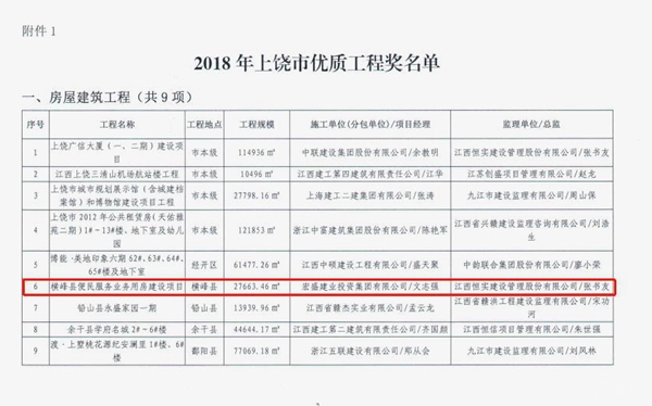 近日,從上饒市住建局文件(饒建發(fā)﹝2019﹞194號)獲悉,上饒市住房和城鄉(xiāng)建設局對上饒市優(yōu)質(zhì)工程進行表彰通報,宏盛建業(yè)承建的三項優(yōu)質(zhì)工程受到表彰。