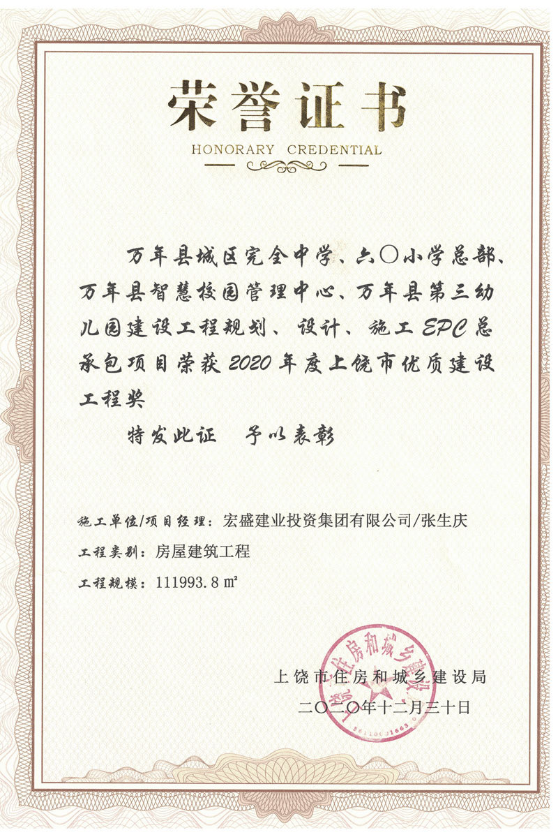 萬年縣城區(qū)完全中學、六〇小學總部、萬年縣智慧校園管理中心、萬年縣第三幼兒園建設工程規(guī)劃、設計、施工EPC總承包項目榮獲“2020年度上饒市優(yōu)質(zhì)建設工程獎”;