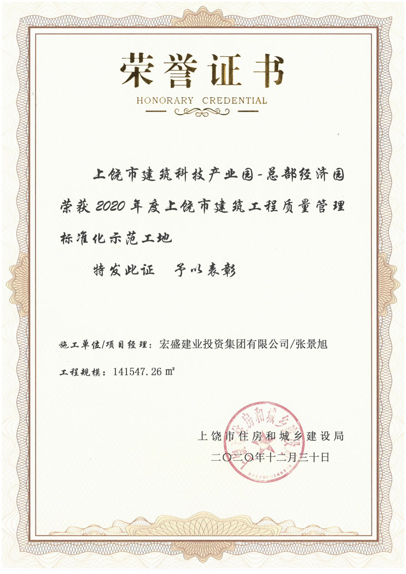 上饒市建筑科技產(chǎn)業(yè)園-總部經(jīng)濟園項目榮獲“2020年度上饒市建筑工程質(zhì)量管理標準化示范工地”。