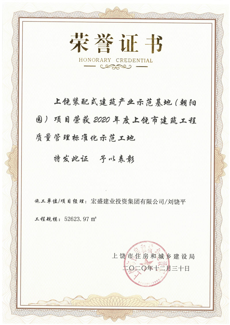 上饒裝配式建筑產(chǎn)業(yè)示范基地(朝陽園)項目榮獲“2020年度上饒市建筑工程質(zhì)量管理標準化示范工地”。