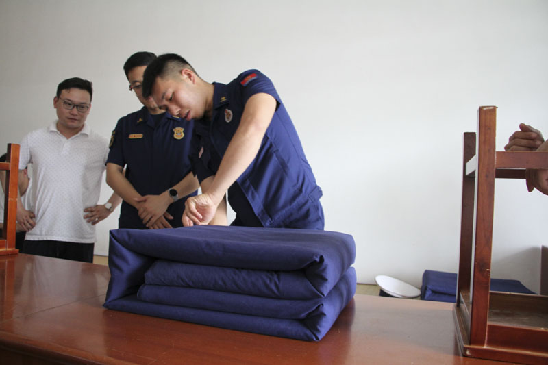 培訓結束后,喬副站長又帶著我們參觀了整個救援站,讓我們親自試穿了一下防火戰(zhàn)斗服,并結合接警出動到滅火救援的全過程進行了細致的講解,參觀內務時,還給我們展示了一個“豆腐塊”軍被是如何疊出來的。一整個下午的時間,讓全體人員對消防基本知識和滅火技能有了更加全面的認識。