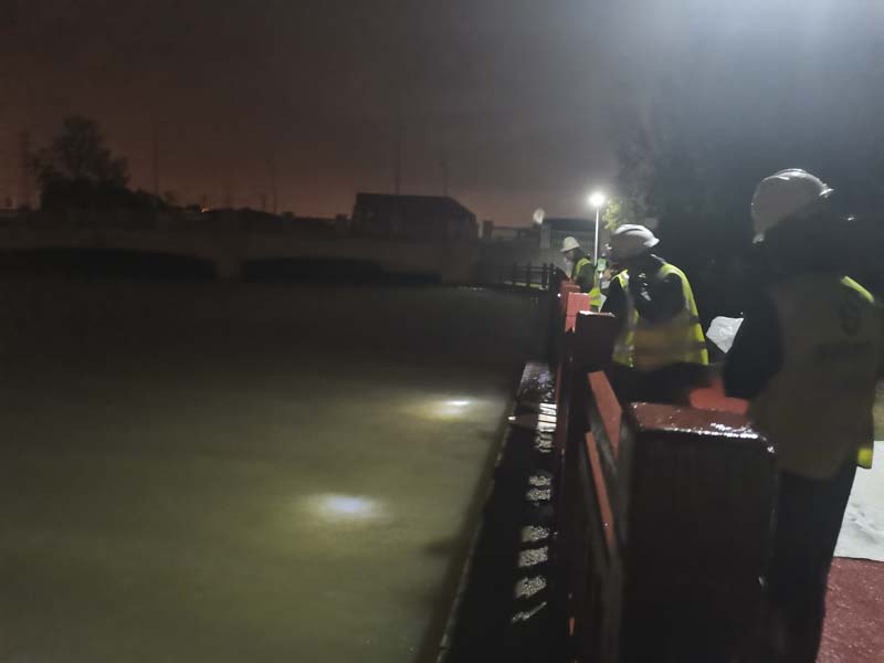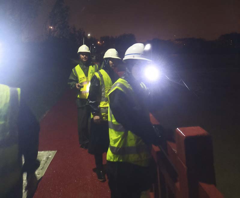 由于臨河水位的不斷上升,避免漲水淹沒我司做的地下工程,立馬調(diào)來三臺(tái)挖掘機(jī)和兩臺(tái)渣土車連夜工作,現(xiàn)場(chǎng)挖土加高項(xiàng)目南側(cè)的路面?,F(xiàn)場(chǎng)狂風(fēng)暴雨,搶險(xiǎn)支援隊(duì)的同事始終站在大雨中一絲不茍地指揮著。