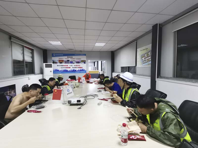 汗水雨水夾雜在一起,部分員工的衣服已經(jīng)全濕。一到現(xiàn)場(chǎng)就先開始了展開工作,直至深夜大家才吃上晚餐。據(jù)了解,宏盛醫(yī)都項(xiàng)目搶險(xiǎn)支援隊(duì)從25日下午開始,一直忙到27日凌晨三點(diǎn),大家始終堅(jiān)守在抗擊臺(tái)風(fēng)的第一線,連續(xù)奮戰(zhàn)2天2夜,安全優(yōu)質(zhì)地完成了抗擊臺(tái)風(fēng)的任務(wù),充分彰顯出宏盛人“特別能吃苦、特別能戰(zhàn)斗、特別能奉獻(xiàn)”的精神特質(zhì)。