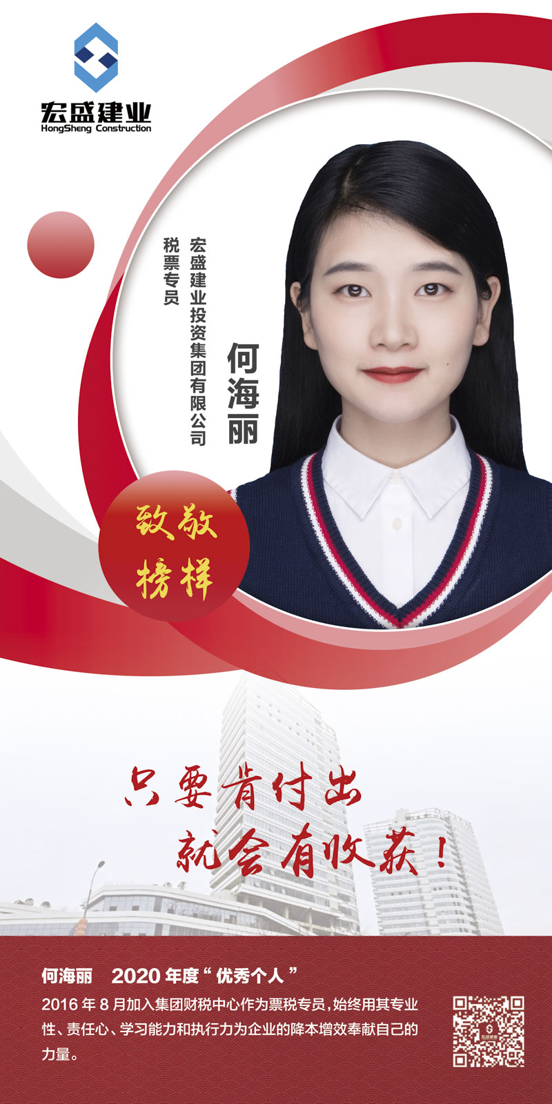 在我們的生活工作中,總有那么一群優(yōu)秀的人,他們始終保持愛崗敬業(yè)、無私奉獻(xiàn)的熱情奮戰(zhàn)在一線,燃燒自己去照亮每一個平凡的崗位。宏盛建業(yè)投資集團(tuán)2020年度“優(yōu)秀個人”——財稅管理中心何海麗便是其中一位。