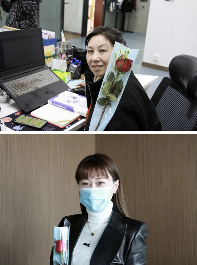 公司還為女同事們每人送上一朵玫瑰花,同時(shí)為三月份過生日的員工慶生。